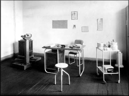 L'infirmerie est en 1947 un modèle de sobriété et d'austérité. On y trouve le minimum, la balance et quelques objets. Ce n'est guère une invitation à être malade! |