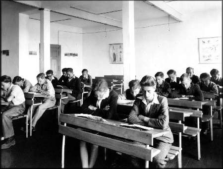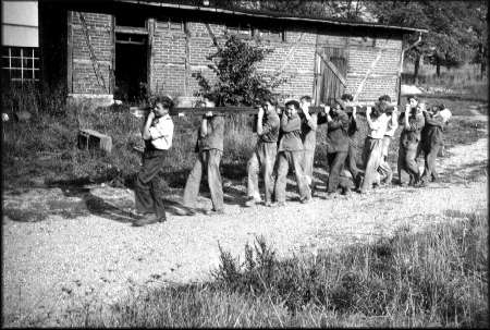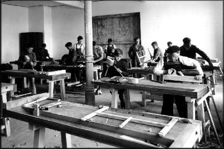 Le travail, c'est pour cette raison que les élèves sont au Centre... Voici quelques scènes choisies. ![]() 1947 : Comment avoir l'air plus studieux? ![]() Les menuisiers à l'oeuvre, qui posent pour la photo, sous la surveillance de leur professeur. ![]() Les élèves, ici en 1949, participent aussi à la remise en état de leur école. C'est sur cette photo, symbole de l'entraide et de la solidarité, que s'achève notre petit voyage dans le passé. J'espère qu'il fut bon pour vous, car j'ai pris du plaisir à l'organiser. Pour quitter ces pages, cliquez ici. |
